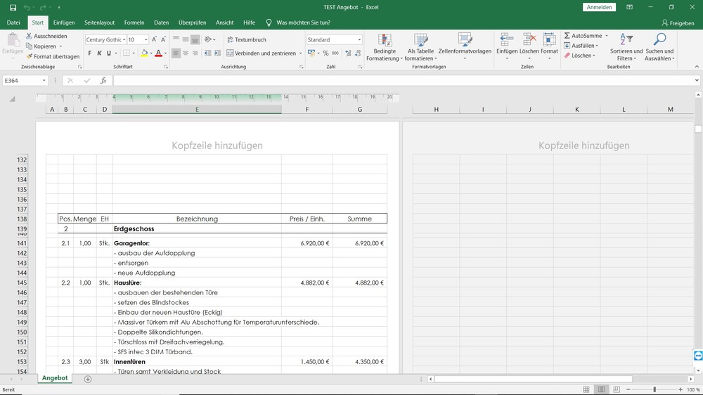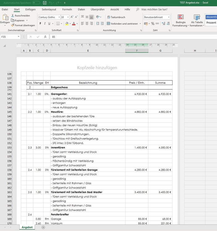 Ich habe eine Frage zu Excel. Vers. 1810 Der Kunde erstellt mit Excel seine Rechnungen. Ich weiß nicht weshalb das so gemacht wird!? Wir haben es ihnen so definitiv nicht empfohlen! Jedenfalls geht es darum, dass die Darstellung der Exceleinträge auf allen Arbeitsplätzen identisch sein muss. Ansonsten kann auf die vorgesehene Rechnungsvorlage nicht korrekt gedruckt werden. Bei Mitarbeiter A funktioniert alles wie gewünscht. Unter "Kopfzeile hinzufügen" sind 2 Zeilen Abstand. (Siehe Screenshot 1) Beim Notebook von Mitarbeiter B werden automatisch weitere Zeilen hinzugefügt. Die Positionen verschieben sich dadurch und es kann nicht mehr wie geplant auf die Vorlage geruckt werden. Die beiden Geräte sind nahezu identisch. Mitarbeiter A Win7 Pro Office 365 Vers. 1810 Mitarbeiter B Windows 10 Office Home and Small Business 2016 Vers. 1810 Ich habe die Einstellungen unter dem Reiter "Ansicht" kontrolliert. Hier ist alles gleich eingestellt. Am Notebook von Mitarbeiter B ist eine niedrigerer Bildschirmauflösung eingestellt. Aber das wird wohl keine Auswirkungen auf die Darstellung von Excel haben. Wenn ich die Excel Datei auf meinem PC öffne wird sie richtig (wie bei Mitarbeiter 1) angezeigt. Das Problem liegt wohl nur am Notebook von Mitarbeiter 2. Danke für eure Tipps! Andi