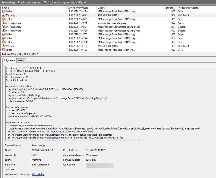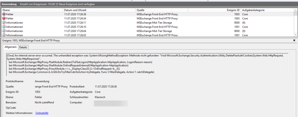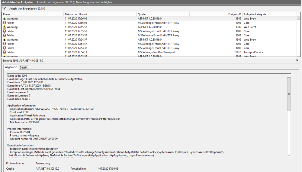 Hallo zusammen, nach einem Update von Exchange CU15 auf CU17 unter Exchange 2016 habe ich keinen Zugriff mehr auf /owa oder /ecp. Sämtliche Tricks wie z.B hier erwähnt mit der Rekonfiguration von SharedWebConfig.config (https://www.frankysweb.de/exchange-2016-serverfehler-in-anwendung-owa-und-ecp-nicht-aufrufbar/) habe ich bereits probiert - bringt keinen Erfolg. Auch habe ich von unserem CU15-Exchange die betroffenen Dateien genommen und am CU17-Exchange ausgetauscht, was leider nicht funktioniert hat. Nach iisreset startet IIS neu, die Clients verlieren kurz die Verbindung und anschließend zeigt es wieder die gleiche Fehlermeldung an. Ich weiß leider nicht mehr weiter - hat jemand einen Rat, wo ich schauen kann, um das Problem zu debuggen? In der Ereignisanzeige bekomme ich folgendes angezeigt (ERROR-ID 1003): Danke für Eure Antworten!