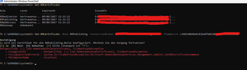 Hallo Jan, leider endet es mit -ImportPath und -Password mit der gleichen Fehlermeldung. -Thumbprint funktioniert auch unter 2025, bei den Rollen RDWebAccess und RDRedirector funktioniert dieser. -