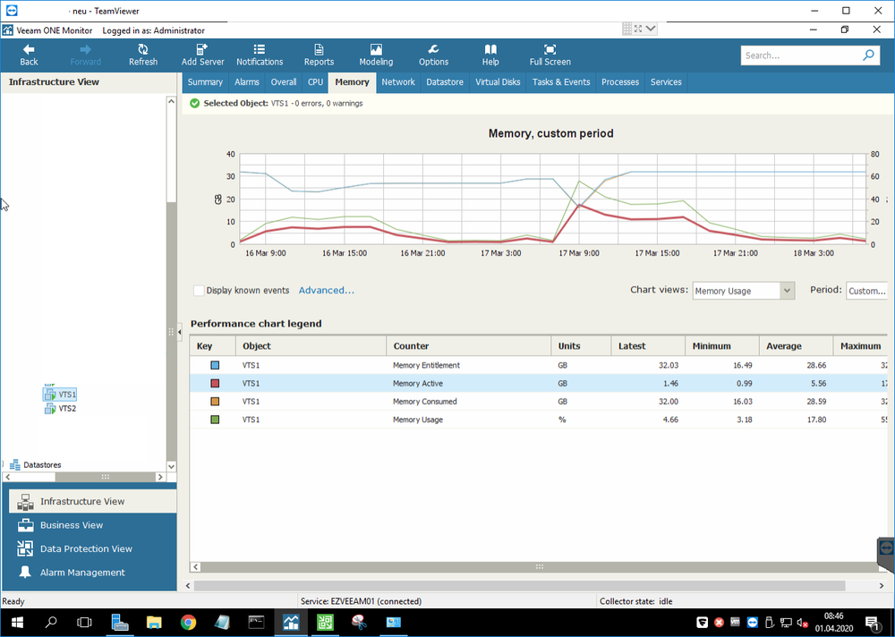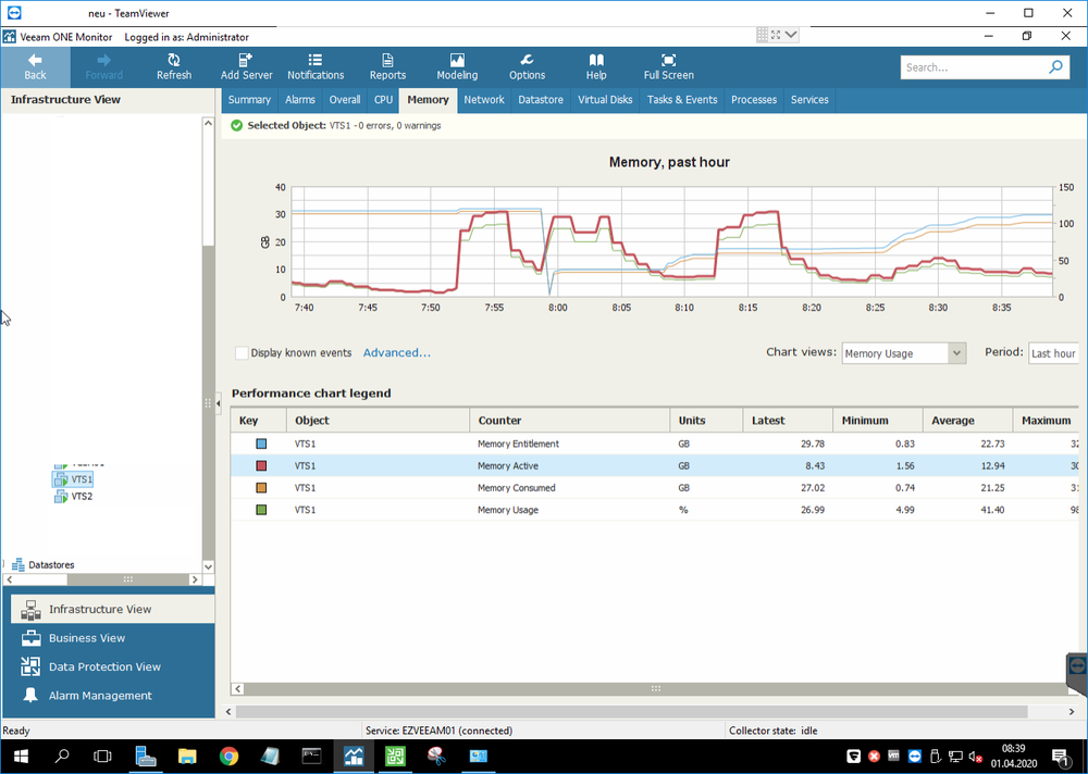 11. Hallo liebes Forum wir haben seit 17. März Probleme mit zwei Windows 2016 Std. VMs, die als Terminalserver im Verbund laufen, einer davon ist der Broker. Die VMs frieren nach dem Hochfaren bei der ersten Anmeldung komplett ein (auch bei einem lokalen Konto). Sie antworten dann auch nicht mehr auf Ping. In der VMware Konsole kreiselt teilweise noch der Kreis bei der Anmeldung, teilweise bewegt sich aber gar nichts. Nach Zeitraum x, meist ca. 10 Minuten, reagieren sie auf einmal wie von Geisterhand wieder, auch der Ping kommt ab dem Zeitpunkt wieder zurück. Das Verhalten zeigen sie wie es aussieht nur nach dem Boot, wenn sie durchlaufen gibt's keine Probleme. Da es ab dem 17. März auftrat und an dem Tag bzw. wahrscheinlich in der Nacht auch Updates installiert wurden, hatte ich natürlich Windows Updates im Verdacht, habe auf einen Stand von der Woche davor zurückgesichert - kein Unterschied, Fehler tritt auch ohne die Updates vom 17. März auf. Der Fehler tritt übrigens auch nicht bei jedem Boot auf! Es wirkt willkürlich. Ist-Umgebung: 3 Fujitsu ESXi Hosts welche im Cluster mit HA-Unterstützung laufen (noch unter VMware 6.0). Speicher ist ein Dell Unity das per FC angebunden ist. Der Fehler tritt nur bei diesen beiden VMs auf. Wir haben noch einen anderen 2016 Std, der zeigt das Verhalten nicht, hat aber auch nicht die aktuellsten Updates. Es wurde an den VMs nichts installiert, da hat sich seit Monaten nichts geändert. Sie wurden ursprünglich Ende 2017 installiert, waren seit Mitte 2018 im produktiven Einsatz und liefen seitdem reibungslos durch. Der Fehler tritt auf jedem Host auf. Auch wenn man die VMs komplett heruntergefahren hatte. Die Auslastung der Hosts ist nicht außergewöhnlich. Wir haben schon alle VMs heruntergefahren und die Hosts neugestartet, sie liefen seit 240 Tagen - keine Besserung. Wir haben sogar einen Ersatz-Host dort ins Netz gebracht, aktuelle und ungenutzte Hardware von vor 2 Jahren, der Datenspeicher ist ebenfalls ein anderer (per NFS von OpenE eingebunden), die Switches etc. über die er ins Netzwerk geht sind andere. Der Host (Supermicro) läuft unter VMware 6.5, wir haben die VMs also auf diesen Host zurückgesichert, auf 6.5 aktualisiert, die VMware Tools aktualisiert. Das lief die ersten 10 Neustarts dann auch, weswegen wir Kompatibilitätsprobleme mit 2016 und VMware 6.0 im Verdacht hatten - bei Tests gestern Abend trat der Fehler dort aber wieder auf. Man findet auch in keinem Log Fehler, weder im vSphere, noch in VeeamOne. Die einzige Auffälligkeit die ich dort feststellen konnte war das hier, Speichernutzung ging unter die Decke, obwohl die Maschine nichts gemacht hat. 32GB Ram, die normalerweise auch bei voller Nutzeranzahl nicht über 25GB Auslastung gehen. Zur Wiederholdung: es passierte in diesem Zeitraum auf der VM absolut nichts. Man sieht, dass es sich ab etwa 8:20 Uhr (erster Screenshot) bzw. 9 Uhr (zweiter Screenshot) wieder normalisiert hat, ab dann arbeiten die VMs als wäre nichts gewesen und bringen auch normale Performance. So langsam gehen mir die Ideen aus. Die Terminalserver neu zu installieren wollte ich mir wenn möglich ersparen, zumal ich bei meiner Recherche Beiträge gesehen habe, wo der Fehler auch nach Neuinstallationen auftrat.