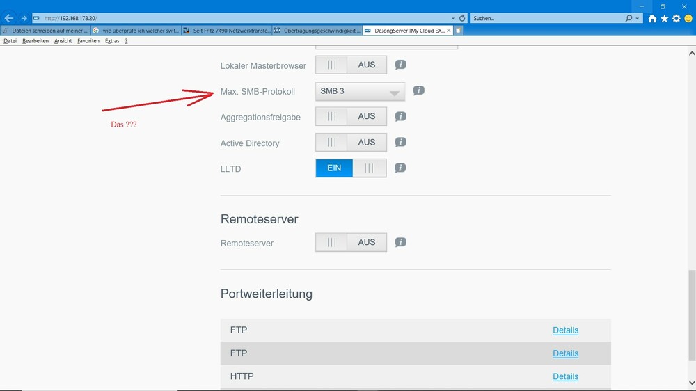 Hallo liebe Forum Mitglieder. Ich habe mir eine My Cloud EX2 Ultra mit 2 x 4 TB zugelegt. Habe sie per LAN-Kabel an meiner Fritz Box 6591 angeschlossen. Ein Heimnetz eingerichtet, mit einem Laptop und einem Desktop PC. Das Netzwerk läuft soweit ganz gut, doch habe ich das Gefühl, dass das schreiben von Dateien auf der Cloud sehr langsam ist. Ich habe eine Access Datenbank auf dieser Cloud und mit dieser speichere ich über verschiedene Formen PDF-Dateien ab. Wenn ich diese auf die Cloud speichere und über dem Explorer das entsprechen Verzeichnis offen habe, sehe ich wie erst eine Temp-Datei zu sehen ist und erst nach mehreren Sekunden später erst die PDF-Datei auf der Cloud fertig geschrieben ist. Ich empfinde dieses als sehr langsam, da die Cloud ja im Internet als sehr schnell angepriesen wird?! Ich bin mit Netzwerken usw ziemlicher Anfänger und deshalb suche ich hier Hilfe. Woran kann das liegen? Ich habe schon gegoogelt und immer nur etwas gefunden, wo steht, das man seine Netzwerkarte richtig einstellen sollen. Da habe ich schon einiges ausprobiert und Internet-Geschwindigkeitstest durchgeführt. Ich habe einen Gigabyte Internetzanschluss an einer Fritz Box 6591 und die Geschwindigkeit wird bei allen Speedtestseiten als voll ausgereizt angezeigt..also, das was ich haben muss. Ich glaube, das es irgendwie an meiner Cloud selber liegen muss? Ich hoffe, das ihr mir hier helfen könnt? …..aber bitte denkt dran, ich bin Anfänger......nicht soviel Fremdwörter ;) Gruß Mike