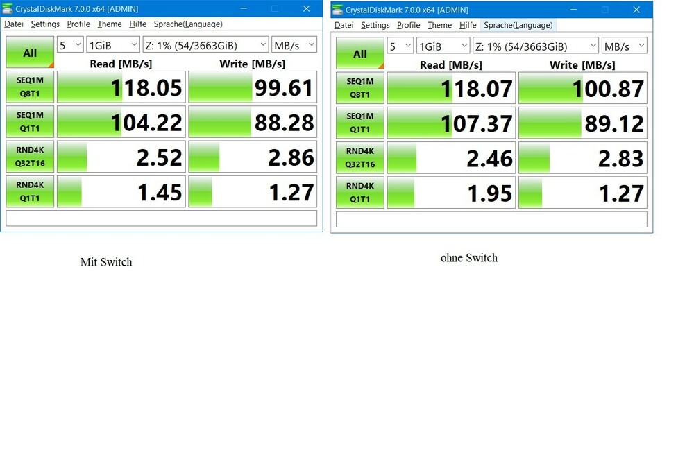 Ja ich habe einen Switch an der Fritz Bos....diesen habe ich hinter einer TV-Wand versteckt. Aber die Cloud ist nicht am Switch sondern direkt an der Fritz Box Habe gerade mir ein Testprogramm CristalDiskmark installiert und einen Test mit und einmal ohne Switch gemacht. Das Bild zeigt die Ergebnisse. -