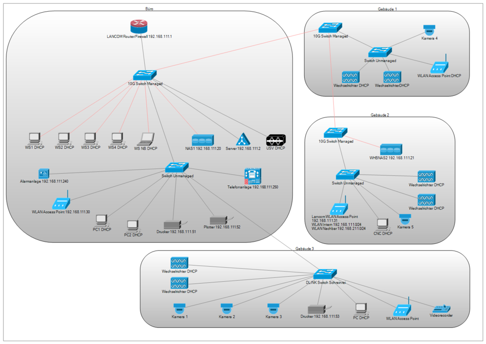 Guten Morgen, vielen Dank für deine ausführliche Antwort, mit so einem Beitrag hatte ich schon gar nicht mehr gerechnet... Wie schon erwähnt, ich bin in meine Situation so hineingerutscht, habe eine Weiterbildung zum Betriebsinformatiker abgeschlossen und mache die Administration neben meinem eigentlichen Job hier in der Firma. (Ja, ich weiß, das sich jetzt bei einigen hier wieder die Nackenhaare aufstellen, bitte spart euch die Kommentare ) Ich habe daher keine praktischen Erfahrungen mit VLANs, möchte mich aber jetzt einarbeiten. Vieles teste ich zu Hause soweit es eben geht. Aber mit der Fritzbox sieht es ziemlich mau aus mit VLANs. Ich probiere hier nichts in dieser Umgebung, wenn ich vorher nicht geklärt habe ob das so funktioniert. Bezüglich meinem ersten Vorhaben hier ganz am Anfang hatte ich bereits vorab mit einem Techniker von der Telekom gesprochen, der nichts anderes macht, als Lancom Router zu konfigurieren. Ihm habe ich mein Vorhaben genau so erklärt und er meinte, dass kann man so machen und wird auch problemlos funktionieren. Aber dank euch weiß ich jetzt, dass das Käse ist... Aber egal, soviel dazu Naja, davon gehe ich aus, die Lancom Router, gehören jetzt nicht gerade zum Billigsegment. Für das neue Setup gibt es aufgrund der noch offenen Fragen noch keinen Netzwerkplan. Der Bestand sieht so aus: (Die roten Verbindungen sind 10G Leitungen (Kupfer) Sorry für die für euch vermutlich blöde Frage aber ich war die ganze Zeit der Meinung das der Router meine diversen Netze (VLANs) verbinden muss. Ich bin davon ausgegangen das ich am Lancom die IP-Bereiche definieren und dann eben ein VLAN zuordne. Die Geräte werden dann mit statischen Adressen in den entsprechenden VLANs definiert und finden über den Router auch wieder in die anderen VLANs. Die 10G Switche sind Netgear XS716T ProSAFE 16-Port, das sind Layer 3 Switche. Ist eure Empfehlung dann das Routing vom Switch erledigen zu lassen? Die IP-Bereiche stellt aber dennoch der Router?! Da wir kein Großkonzern sind, möchte ich es möglichst einfach halten, daher war mein Gedanke, Server, PCs, Drucker usw. in ein Netz zu packen. Und dann nur Bereiche abtrennen, die zum produktiven Arbeiten gar nicht benötigt werden. (Videoüberwachung, Photovoltaik usw...) Ja, das war ja nur die ursprüngliche Idee, die ich inzwischen verworfen habe...