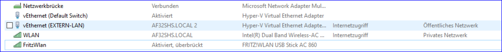 3. Hallo, ich mag kurz noch eine Rückinfo geben. Ich habe es jetzt mit Umwegen am laufen wie ich es brauche. Ich habe einen FritzWlan Stick AC860 mit einem externen vSwitch verbunden. Damit ist der Host quasi mit zwei NICs am WLAN wobei nur der eine für den Host genutzt wird. Hier die Netzwerkumgebung im Host OS: Hier die Netzwerkumgebung im VM-OS: Ist zwar nicht die ideale Lösung aber viele Wege führen nach Rom Sollte ich das Host OS mal neu installieren wäre es dann auch die Gelegenheit mal einen Anlauf zu nehmen NAT über den eingebauten WLAN Adapter zu machen. Wenn es denn dann geht.... Bis dahin bleibt es einfach so wie es jetzt ist und an dieser Stelle vielen Dank für die Beiträge und Hilfe.