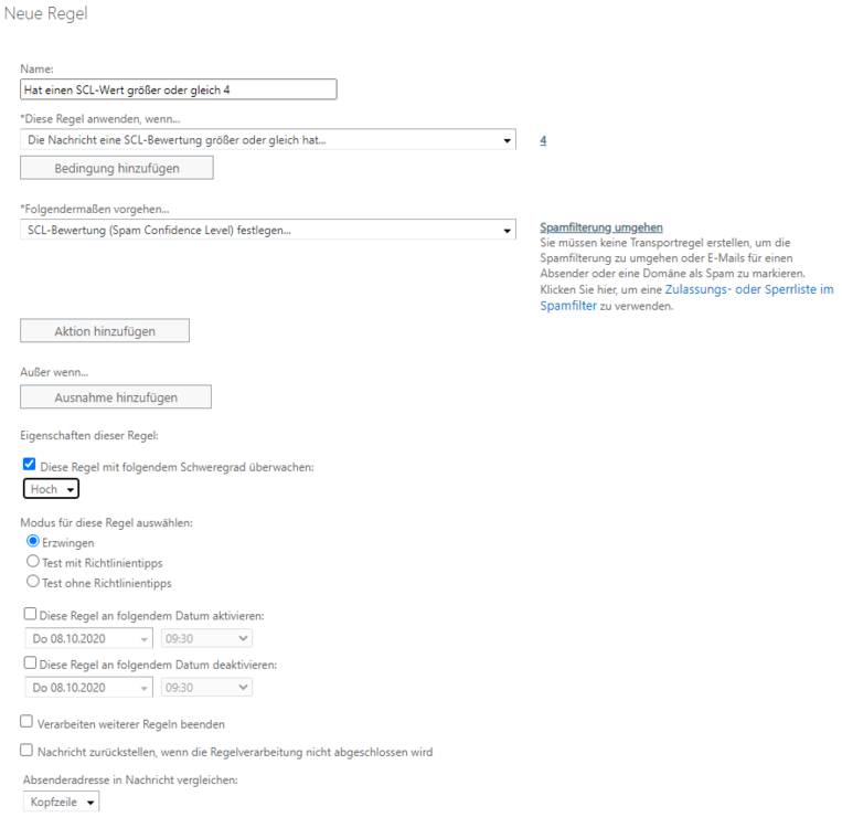 3. ich danke dir echt für die raschen antworten. Frage 1: ist der "hohe" SCL Level der grund, dass die e-mails in den junk ordner gehen? Frage 2: was genau soll ich konfigurieren? soll ich eine Regel bei nachrichtenfluss erstellen? Wenn ja passt das so? oder soll ich das wo anders einstellen? hätte sonst nicht wirklich was dazu gefunden.