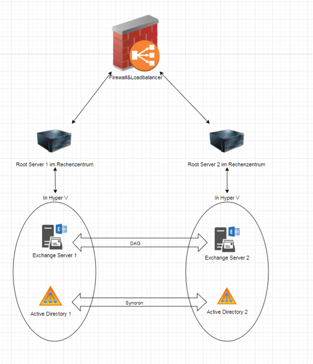 Auf beiden Rootservern läuft jeweils, über HyperV virtualisiert, ein Exchange Server 2019 und ein Active Directory Domain Controller. Ich verfolge damit das Ziel, dass jeder Exchange Server seinen DC nimmt, der Hardwaremäßig zu ihm gehört. Somit habe ich auch die Active Directory Umgebung redundant, da sich ja beide DCs permanent abgleichen (ist das so korrekt?). Zusätzlich sind beide Exchange Server in einer DAG. Wird ein Benutzer durch den Loadbalancer zum "falschen" Mailserver geleitet, auf dem eigentlich nicht sein Postfach liegt, kümmert sich das DAG Prinzip trotzdem darum, dass dieser Benutzer trotzdem bedient wird. So habe ich es aus den Microsoft Dokus entnommen. Ist das eine gute Praxis?