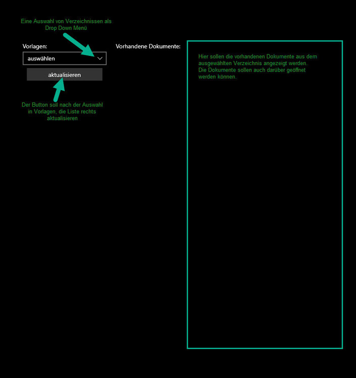 Der aktualisieren Button, soll dann den rechten grünen Block aktualisieren in dem dann die .docx Dateien aufgelistet werden. Die .docx Dateien, sollen dann mit einem Doppelklick ausführbar sein.