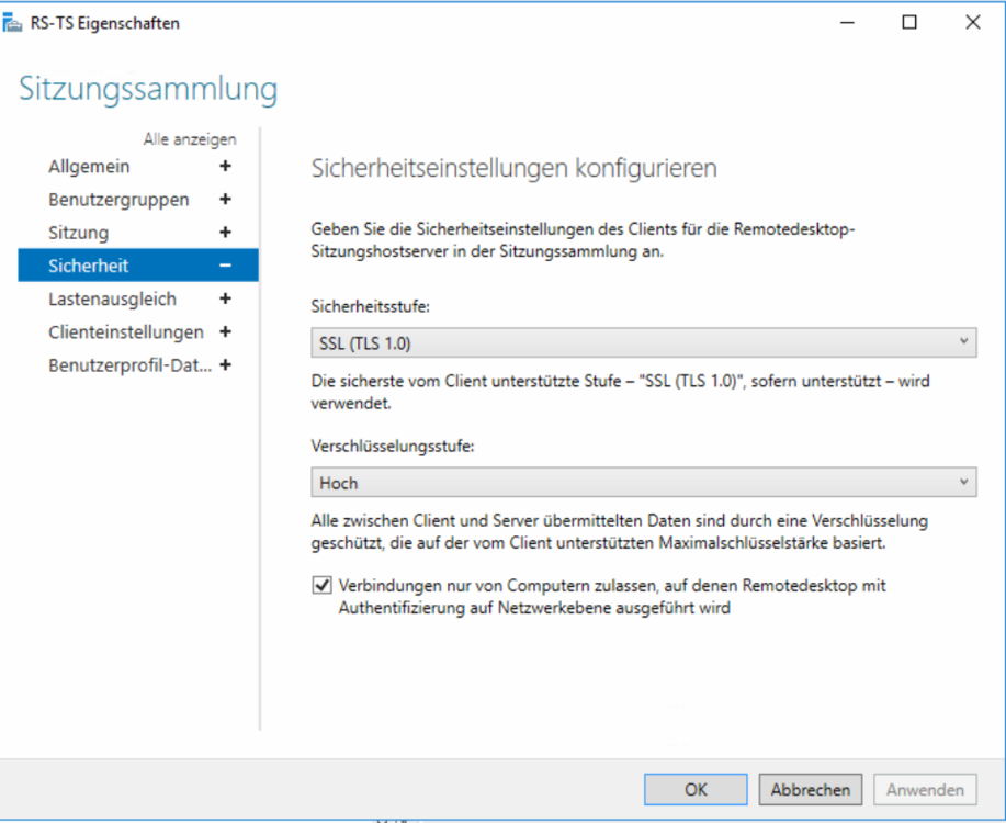 Hallo zusammen, folgendes Szenario, ein RDP Sitzungssammlung (Server 2019) bestehend aus 3 Servern wurde aufgrund von Windows Updates neugestartet. Nach diesem neustart der Server erhalten alle Windows 10 Clients folgende Meldung: Die RDP Dienste laufen auf allen Servern, die Anmeldung auf die Console über mstsc /admin ist auch möglich. Die User haben weiterhin die entsprechenden rechte. Auch wenn ich die Sicherheitsstufe auf RDP stelle oder auf aushandeln und die Verschlüsselungsstufe auf niedrig ist keine Verbindung mehr möglich. Ich habe schon diverse Support Artikel gelesen allerdings brachte keine den gewünschten Erfolg. -