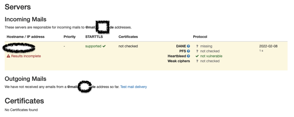 https://ssl-tools.net/ claims that there is no certificate for mail.domain.de, although we have installed and enabled the respective certificate in Exchange.