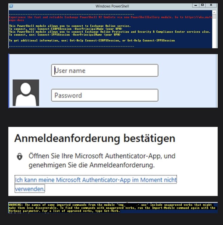2. Hallo zusammen, ich nutze die Microsoft Exchange Online Powershell Module siehe Bild. Ich versuche mich die ganze Zeit mit „Connect-EXOPSSession -UserPrincipalName (Musterman@test.de ) anzumelden. Anmeldefenster taucht auf. Melde mich erfolgreich an. Bestätige es mit der Authenticator App. Und bekomme danach folgende Meldung: WARNING: The names of some imported commands from the module 'tmp_.....uoc' include unapproved verbs that might make them less discoverable. To find the commands with unapproved verbs, run the Import-Module command again with the. Verbose parameter. For a list of approved verbs, type Get-Verb. Es baut keine Verbindung auf. Wieso? Ich kann nichts mit der Meldung anfangen. Vielen Dank im Voraus :)