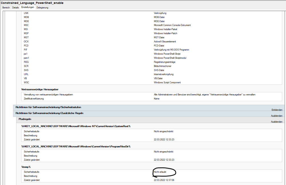 Mit dem letzten Punkt: "oder für Entwicklung eine Gegen-GPO bauen." Meinst du damit einfach, dass ich eine GPO bauen muss, die die Registry wieder auf normalen stand bringt? Sprich bei der Richtlinie sind PS1, PS1M, Batch etc. darin enthalten und die werden in die Registry reingeschrieben. Also muss ich hier einfach eine GPO bauen, die hier diese Einträge wieder entfernt ?