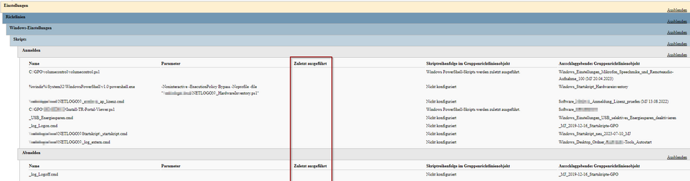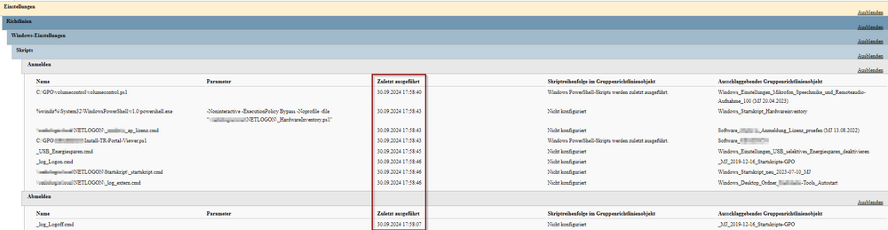 Hallo @daabm, ich habe das nicht richtig beschrieben, mittlerweile kann ich es auch weiter eingrenzen. Es ist definitiv kein Problem auf Computerebene, sondern auf Benutzerebene. Wir haben sechs Skripte, die bei der Anmeldung durchgeführt werden. Diese hängen an einer OU und gelten für alle User gleichermaßen. Nun gibt es genau eine AD Gruppe, wenn ein User Mitglied dieser einen Gruppe ist, wird nur das erste (Reihenfolge in GPResult) Skript ausgeführt, die anderen nicht. Tausche ich die Gruppe gegen eine beliebige andere aus, werden alle Skripte durchlaufen. Ich finde in den GPOs nichts, wodurch die Mitgliedschaft in dieser Gruppe dazu führt, dass nur ein Skript durchgeführt wird. Wie bekomme ich heraus, was hier das Problem sein könnte? Ich habe bereits in den XML-Daten der Policies nach der Gruppe gesucht aber nichts entsprechendes gefunden. Was kann ich her tun? -