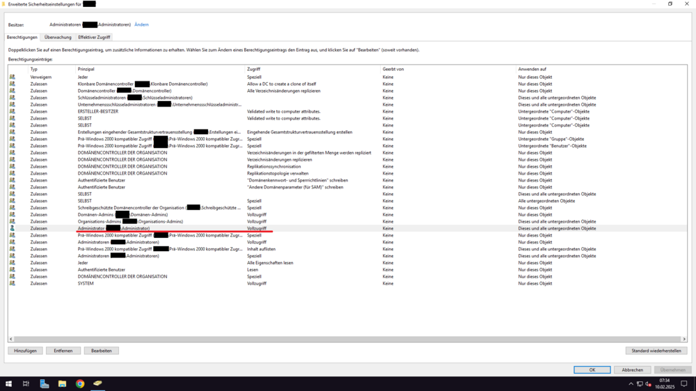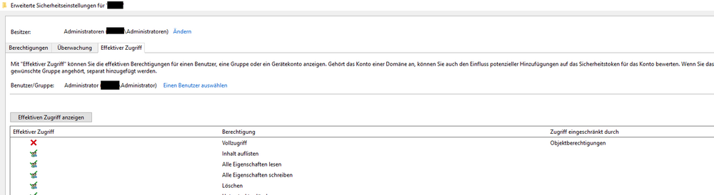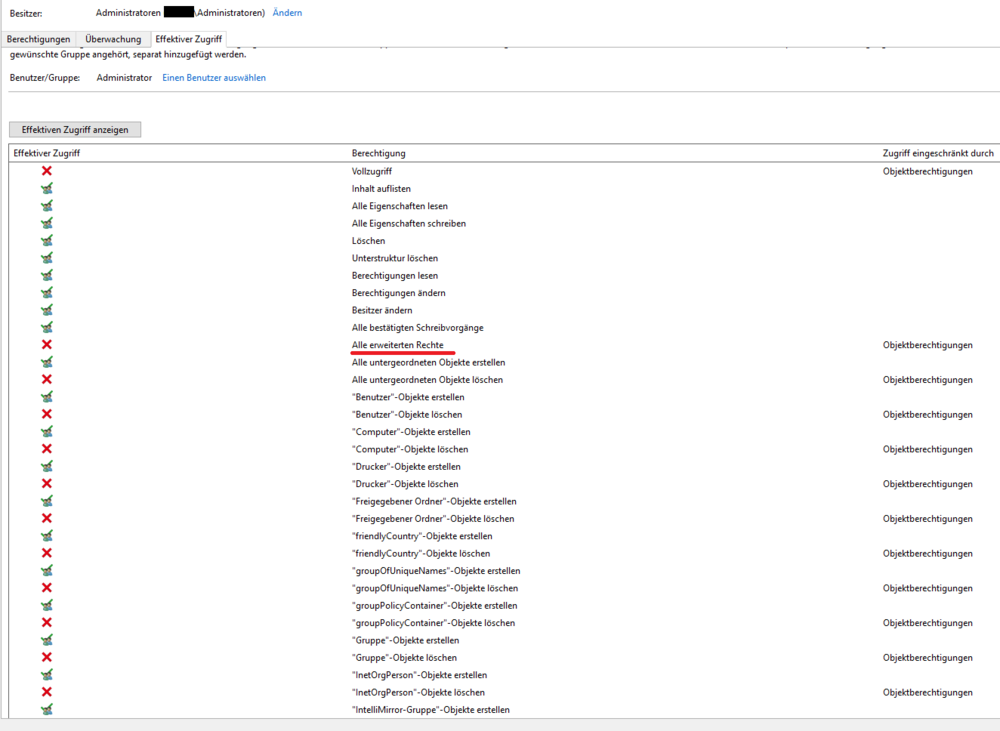 Davon hatte ich bisher immer abgesehen, aus Angst, dann irgendwie eine Sicherheitslücke aufzureißen. Ich habe es jetzt mal ausprobiert, aber keinen Erfolg. Irgendwo ist da der Wurm drin... Anbei zwei Screenshots vom obersten Domänenknoten: Im ersten sieht man, dass ich Vollzugriff für den Administrator eingestellt habe: Im zweiten ist jedoch ersichtlich, dass der Vollzugriff dann wieder eingeschränkt ist: Wie komme ich der Ursache auf den Grund? -