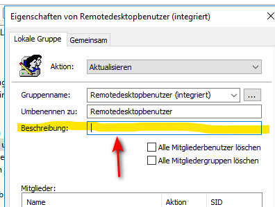 speer 19 Geschrieben vor 9 Stunden Melden Geschrieben vor 9 Stunden Hallo zusammen, existiert bei den "GPP - lokale Gruppen und Benutzer" die Möglichkeit, das Beschreibungsfeld den ursprünglichen Gruppenbeschreibung auf dem Client beizubehalten? Bleibt das Beschreibungsfeld dort leer, wird dies ebenfalls auf dem Client leer übernommen. Bei mir ist es nun so, dass ich mehrere Clients in verschiedenen Sprachen unterstützen muss. Hierzu zählen deutsch, englisch, italienisch und spanisch. Es ist unvorteilhaft die Gruppenbeschreibung unvollständig zu belassen. Existiert die Möglichkeit die Beschreibung beizubehalten ohne Änderung auf dem Client?